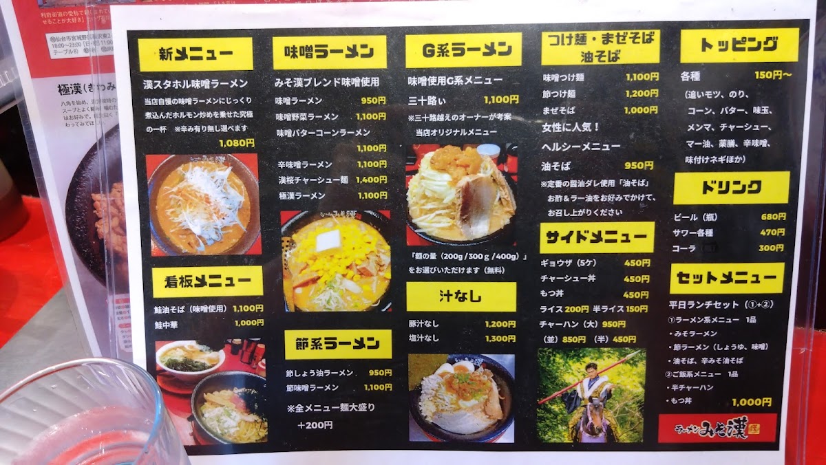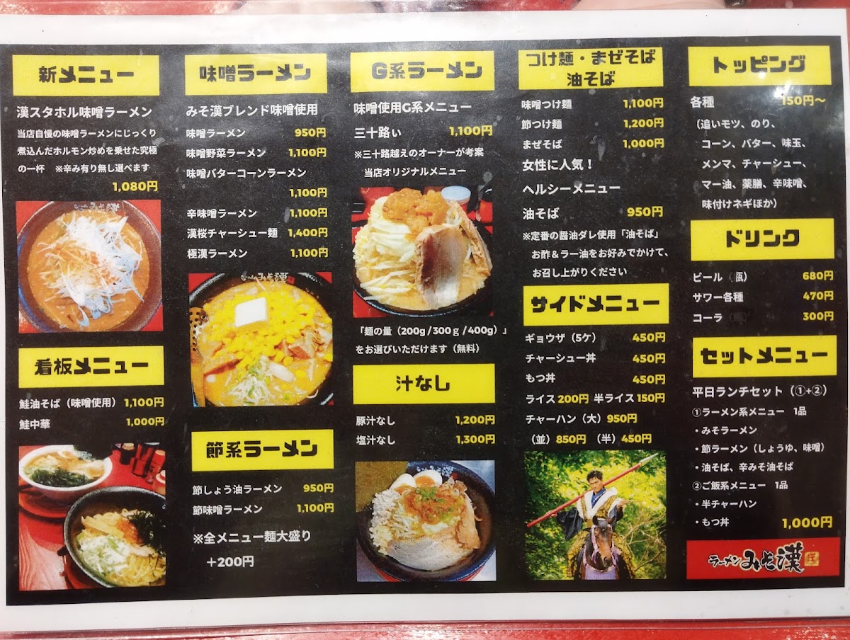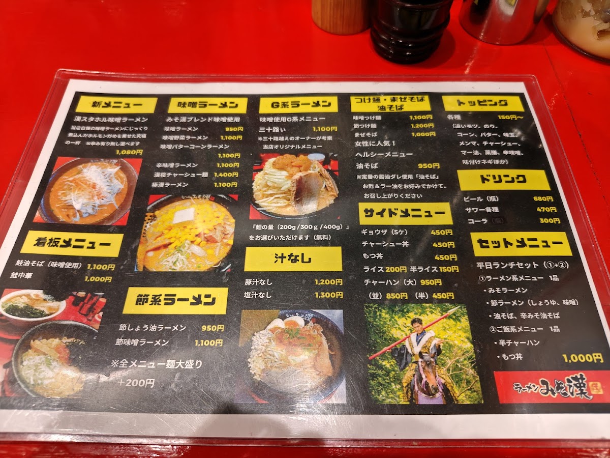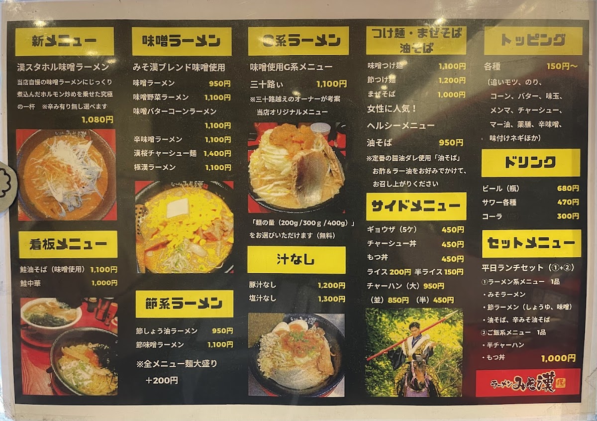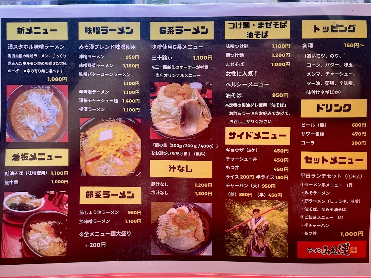 From a reviewer’s standpoint, the menu at Miso Kan in Sendai is centered on hearty, flavorful noodle dishes that highlight the restaurant’s miso expertise. The standout is undoubtedly 漢スタホル味噌ラーメン (Kansutahoru Miso Ramen) at approximately ¥980, a rich bowl built on house‑made miso and tender offal that anchors the menu and showcases the kitchen’s savory depth. Reviewers also note the appeal of other items like the 鮭油そば (Salmon Abura‑Soba) and 鮭中華 (Salmon Chuka), which bring a unique seafood twist to the ramen repertoire and are often mentioned alongside the signature miso bowl in diners’ highlights. Traditional comfort options such as classic miso ramen and variations with vegetable toppings round out the selection, offering a balance between creative specialties and familiar favorites, typically within a ¥1,000-¥2,000 price band that feels approachable for everyday ramen cravings.