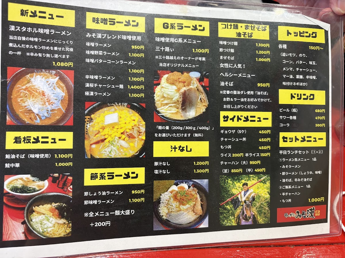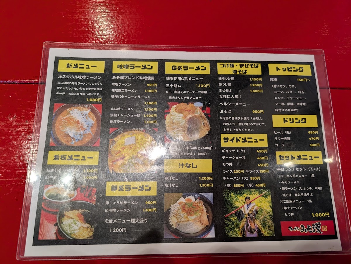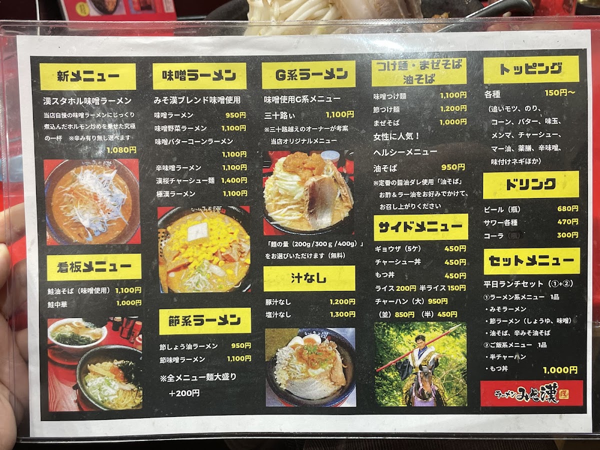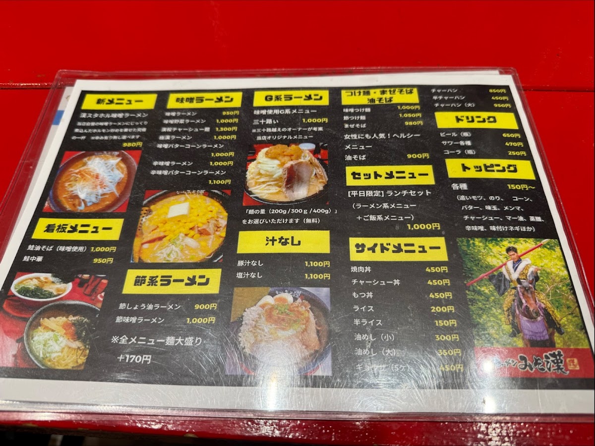 From a reviewer’s standpoint, the menu at Miso Kan in Sendai is centered on hearty, flavorful noodle dishes that highlight the restaurant’s miso expertise. The standout is undoubtedly 漢スタホル味噌ラーメン (Kansutahoru Miso Ramen) at approximately ¥980, a rich bowl built on house‑made miso and tender offal that anchors the menu and showcases the kitchen’s savory depth. Reviewers also note the appeal of other items like the 鮭油そば (Salmon Abura‑Soba) and 鮭中華 (Salmon Chuka), which bring a unique seafood twist to the ramen repertoire and are often mentioned alongside the signature miso bowl in diners’ highlights. Traditional comfort options such as classic miso ramen and variations with vegetable toppings round out the selection, offering a balance between creative specialties and familiar favorites, typically within a ¥1,000-¥2,000 price band that feels approachable for everyday ramen cravings.
